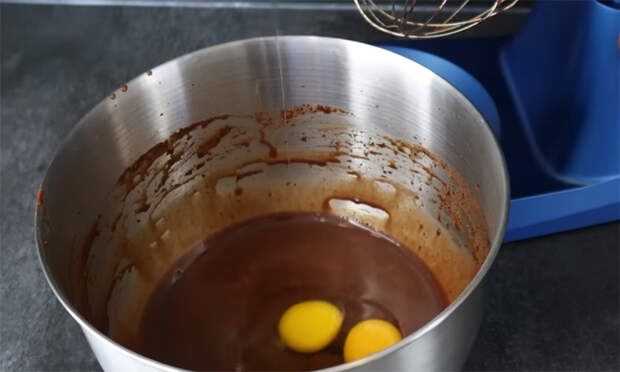 Отправьте сахар и какао в чашу миксера или в глубокую миску, залейте молоком и растительным маслом, затем перемешайте до полной однородности, чтобы смесь стала гладкой и без комочков. Отлейте треть этой шоколадной жидкости по весу, ориентируйтесь на 200 г, и оставьте ее рядом, она понадобится сразу после выпечки. В оставшуюся часть разбейте два яйца, добавьте щепотку соли и ванильный сахар или ванилин, после чего перемешайте до ровной консистенции.