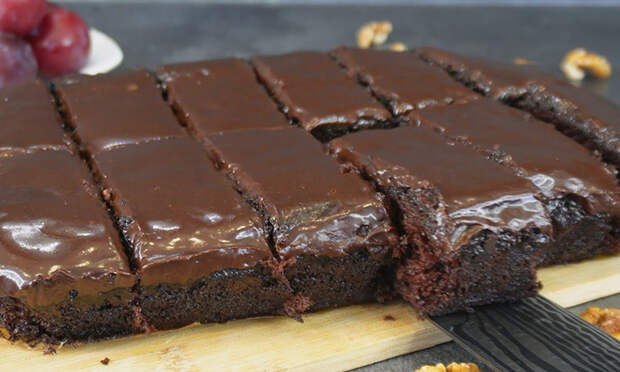 Достаньте пирог и сразу, пока он горячий, залейте сверху отложенной шоколадной жидкостью, распределяя ее по поверхности равномерно. Оставьте пирог полностью остыть прямо в форме, за это время лишняя влага впитается, а верхняя часть станет нежной шоколадной глазурью.
