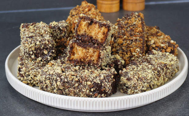 Подготовьте ореховую или кокосовую крошку для обсыпки. Каждый брусочек окуните в шоколадную глазурь и сразу обваляйте в сухой смеси. Уберите десерт в холодильник для застывания глазури.