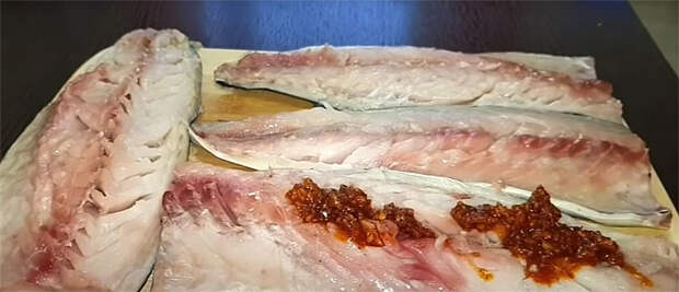 3. Полейте подготовленный соус на филе. С помощью ложки или пальцев аккуратно вотрите соус в рыбу, особенно в местах, где были удалены косточки. Это обеспечит более насыщенный вкус и аромат. Можно оставить филе мариноваться 5–10 минут — это усилит вкус, но необязательно.