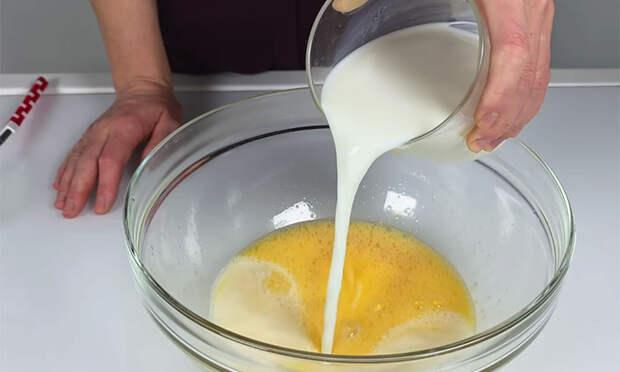 Взбейте венчиком три яйца с солью и сахаром до появления легкой пенки. Влейте половину молока (300 мл) комнатной температуры. Постепенно просейте муку, смешанную с разрыхлителем, и замесите густое однородное тесто без комочков. После этого влейте оставшиеся 300 мл молока и растительное масло. Главный секрет эластичности: влейте в тесто крутой кипяток тонкой струйкой, интенсивно работая венчиком.