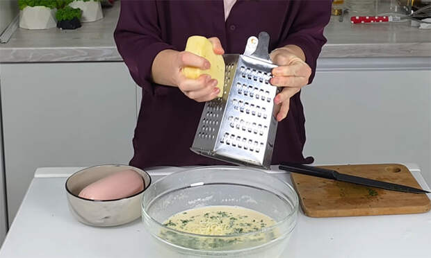 Оставьте тесто отдохнуть на 10 минут — это важно, чтобы мука набухла и блины не рвались. Подготовьте начинку: мелко порубите зелень, а сыр и колбасу натрите на терке с мелким или средним зерном (слишком крупные куски могут рвать тесто). Добавьте начинку в отдохнувшее тесто и перемешайте. Если масса кажется слишком густой, добавьте пару столовых ложек молока.