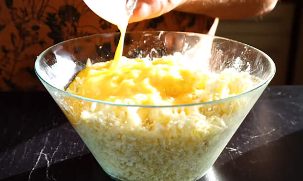 2. Пока тесто «отдыхает», займитесь начинкой. Оба вида сыра натрите на крупной тёрке или раскрошите руками и переложите в большую миску. Смешайте их до равномерной текстуры, при необходимости слегка подсолите, ориентируясь на солёность сыра. Всыпьте в сырную массу муку и тщательно перемешайте — она нужна, чтобы начинка держала форму и не растекалась при выпекании. В отдельной миске слегка взбейте яйца вилкой, затем влейте их к сыру и перемешайте до однородной, густой, но пластичной массы.