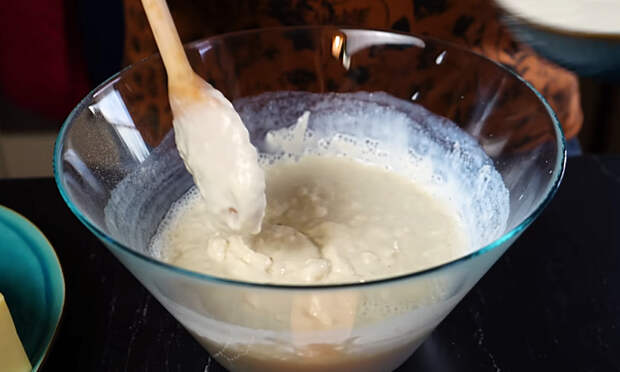 1. В глубокой миске соедините мацони, кефир или греческий йогурт с водой. Перемешайте венчиком или ложкой до однородности: масса должна получиться густой, гладкой, по консистенции близкой к сметане. Добавьте соду, соль и сахар, ещё раз перемешайте и отставьте миску в сторону на несколько минут — в кислой среде сода начнёт реагировать, тесто станет более воздушным.