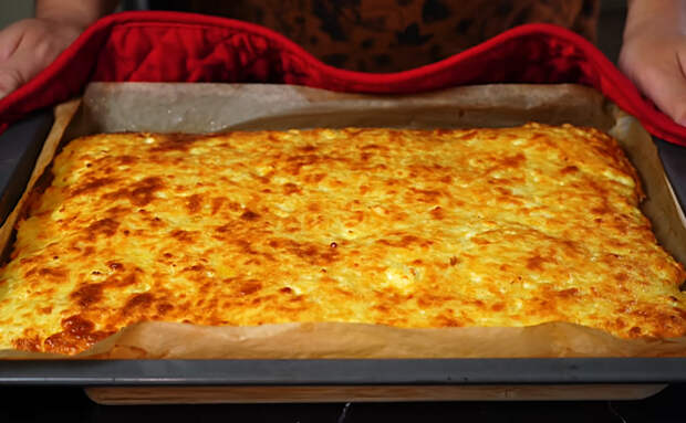 4. Достаньте форму из духовки, выложите сырную начинку поверх запечённого теста и равномерно распределите её ложкой. Верните хачапури в духовку ещё на 7 минут — за это время сыр расплавится, начинка станет кремовой, а края теста подрумянятся.