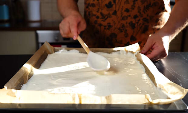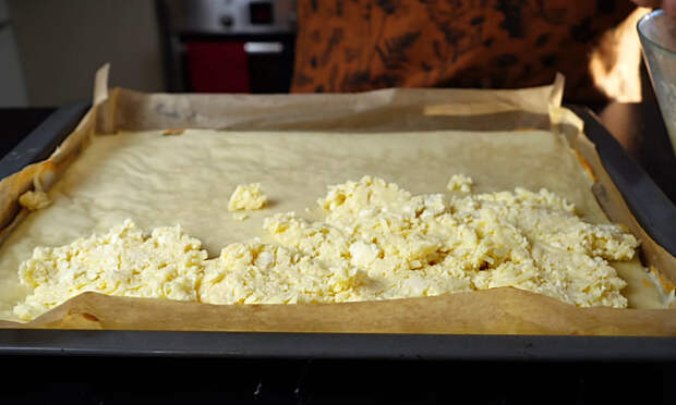 Форму или противень застелите пергаментной бумагой. Вылейте тесто, аккуратно распределите его по поверхности слоем одинаковой толщины и отправьте в духовку на 10 минут, чтобы основа схватилась и слегка подрумянилась.