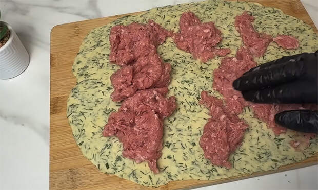 Как только овощи станут мягкими, снимите сковороду с огня и оставьте зажарку в стороне. Достаньте тесто из холодильника и раскатайте его на присыпанной мукой поверхности в тонкий пласт толщиной примерно 2–3 мм. Для начинки положите фарш в миску, слегка посолите его, добавьте щепотку черного перца и хорошо перемешайте до однородного состояния. Равномерно распределите фарш по поверхности раскатанного теста тонким слоем.