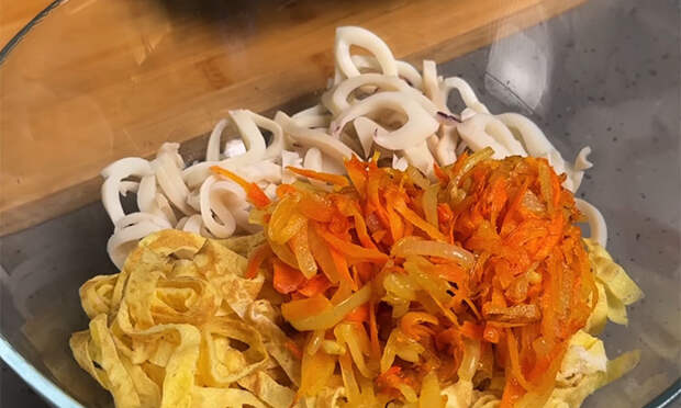 Начните с приготовления кальмаров, опустив их в кипящую подсоленную воду ровно на одну минуту. Сразу откиньте морепродукты на дуршлаг и обдайте холодной водой, после чего нарежьте их тонкими полосками или кольцами. Для яичных блинчиков взболтайте яйца со щепоткой соли и поджарьте на смазанной маслом сковороде два тонких блина.