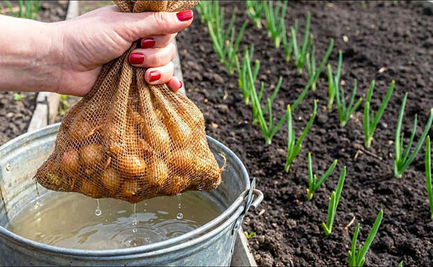 Подготовку начните с тщательного осмотра луковиц: отберите только здоровые экземпляры, отбраковав поврежденные или подгнившие. Для дезинфекции растворите одну чайную ложку соды в глубокой емкости с водой. Опустите лук-севок в этот раствор на 6 часов — это не только защитит от гнили, но и «разбудит» луковицы для быстрого старта. После замачивания достаньте лук и сразу отправляйтесь на грядку.