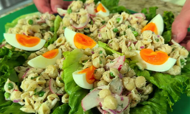 Соедините остывшие макароны с овощами и рыбной заправкой, тщательно перемешайте и проверьте на соль. Для подачи промойте и обсушите листья салата. Выложите по одной большой ложке готового салата на каждый лист. Очищенные яйца разрежьте на дольки и используйте их для финального украшения блюда сверху.