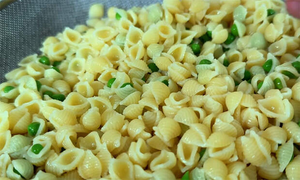 Опустите яйца в кипящую подсоленную воду и варите ровно 9 минут — это обеспечит идеальный кремовый желток. Сразу после варки переложите их в ледяную воду для легкой очистки. Параллельно отварите макароны в хорошо соленой воде до состояния почти полной готовности (чуть дольше, чем аль-денте). За одну минуту до конца варки макарон всыпьте в кастрюлю замороженный горошек для бланшировки. Слейте воду и обязательно промойте макароны с горошком под холодной проточной водой, чтобы остановить процесс приготовления и остудить продукты.