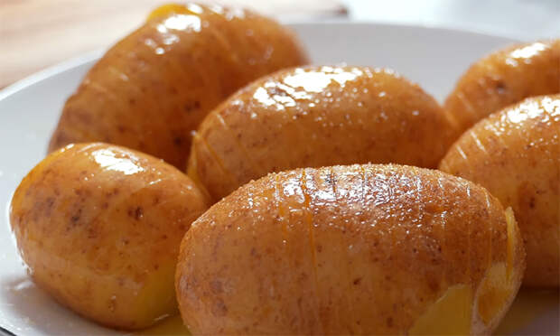 Если картошка запекается целиком без подготовки, она долго готовится и не всегда равномерно пропекается внутри, поэтому в этом рецепте используется двухэтапная технология. Сначала клубни надрезаются и недолго отвариваются, что позволяет добиться мягкой текстуры и ускорить запекание, а затем отправляются в духовку при высокой температуре до румяной корочки.