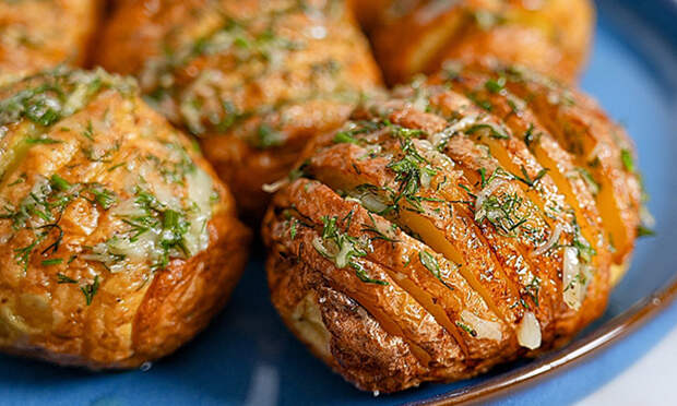 Главный акцент делается на соусе из запеченного чеснока, сливочного масла и свежей зелени, который наносится уже на горячий картофель и заполняет каждый разрез, превращая привычный гарнир в по-настоящему вкусное блюдо.