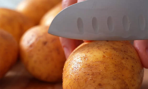 При желании по бокам можно подложить деревянные палочки, которые не позволят прорезать клубень до конца. Эти надрезы нужны для того, чтобы масло и соус впоследствии проникали внутрь. Залейте картофель кипятком и варите 10 минут. Это сокращает общее время запекания и помогает получить более хрустящую корочку после духовки. По истечении времени слейте воду и дайте картофелю слегка обсохнуть.
