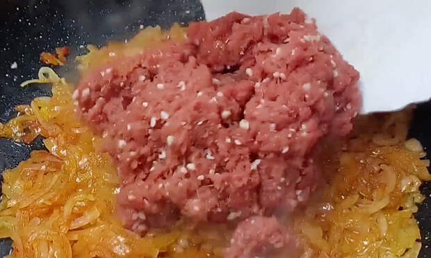 2. Добавьте фарш, посолите, поперчите и тщательно перемешайте. Обжаривайте мясо до полуготовности, чтобы оно стало золотистым и рассыпчатым.