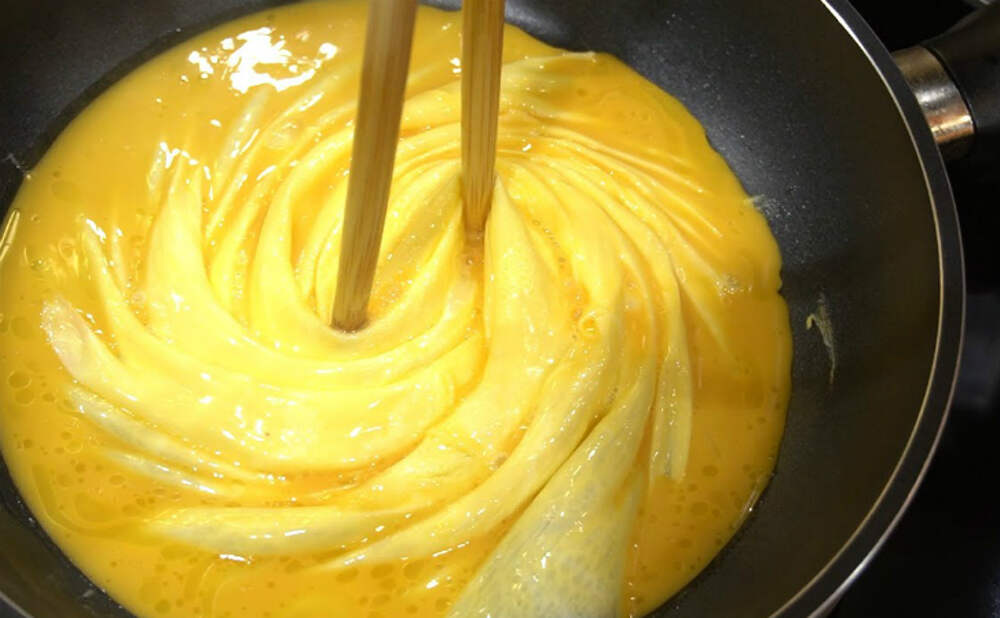 Обычный омлет легко сделать настоящим деликатесом, если приготовить его по корейскому способу. Сам рецепт очень прост: выливаем яйца на сковороду и сразу закручиваем. Для самого омлета нам понадобятся только яйца и соль, это самый простой вариант. Традиционно он подается на уже отваренном белом