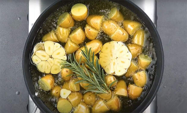 Когда картофель станет мягким внутри и румяным снаружи, уберите чеснок и розмарин, приправьте солью и перцем по вкусу. При желании можно довести картофель до готовности в духовке, запекая 10–15 минут при 180°C.