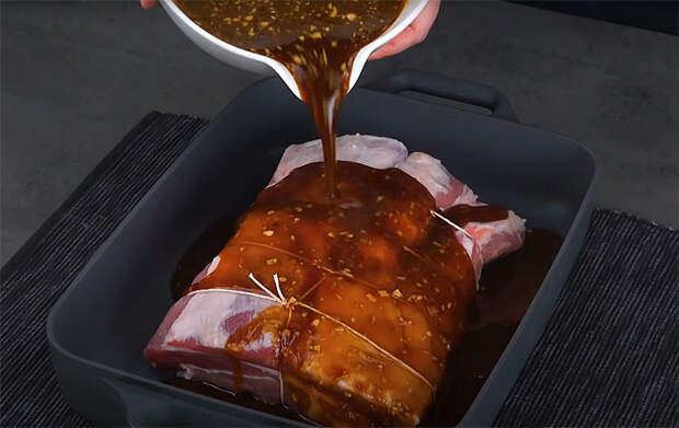 Накройте пленкой и оставьте при комнатной температуре минимум на час, а лучше — уберите в холодильник на ночь. Перед запеканием достаньте мясо за 30 минут, чтобы оно прогрелось до комнатной температуры.
