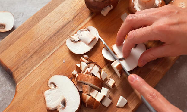 Выложите на эту же сковороду грибы, сначала обжаривайте их на сильном огне без масла до выпаривания жидкости, затем добавляйте немного растительного или сливочного масла и доводите до румяности.