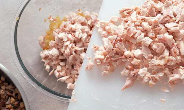 Измельчите куриное мясо, соедините его с луком и грибами, посолите, поперчите и вмешайте натертый сыр, чтобы начинка стала более плотной и слегка связанной от тепла ингредиентов. Разложите блинчики, выкладывайте по две щедрые ложки начинки на каждый и сворачивайте плотным рулетом, чтобы начинка распределилась равномерно.