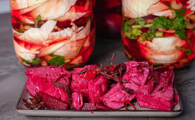В грузинской кулинарной традиции капуста заквашивается сразу со свеклой. Вместе овощи превращаются почти в полноценный салат: капуста остается хрустящей, но пропитывается соками и специями — вместе с ароматами зелени. Такое соленье из капусты разберут быстрее привычных маринованных огурцов и помидоров.