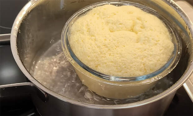3. Перелейте омлетную смесь в жаропрочную миску. Если есть сомнения в герметичности кастрюли, лучше выбрать миску с широкой плоской поверхностью — омлет поднимется ровнее.