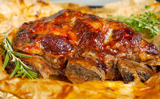 Достаньте мясо и обязательно промокните его бумажными полотенцами, чтобы убрать лишнюю влагу. Заверните ребра сначала в пергамент, добавив к ним чеснок и травы из маринада, а затем плотно оберните фольгой в несколько слоев. Положите сверток на противень и отправьте в духовку: первые 3 часа запекайте при температуре 150 градусов, а затем увеличьте её до 180 градусов и подождите еще один час.
