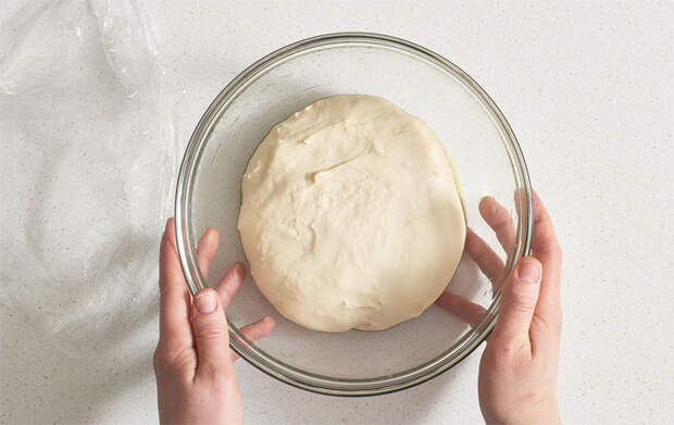 2. После первого подъёма раскатайте тесто тонким слоем (около 3–4 мм). Смажьте всю поверхность растопленным сливочным маслом. Аккуратно сверните тесто в рулет. Нарежьте рулет на кусочки шириной 3–4 см. Каждый кусочек слегка прижмите ладонью, формируя «лепёшечки». Накройте их полотенцем и оставьте ещё на 10 минут в тепле.