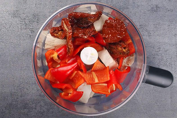 2. В чашу блендера выложите отварное куриное филе, нарезанный сладкий перец и вяленые помидоры. Измельчите до однородного состояния. Если блендера нет, можно пропустить ингредиенты через мясорубку или мелко нарезать и размять вилкой. Добавьте сушеный укроп, соль и черный перец. Перемешайте.