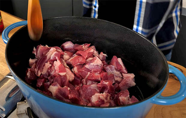 1. Нарезать мясо небольшими кусочками 2–3 см. Разогреть толстостенную кастрюлю с маслом на среднем огне. Обжаривать мясо, пока оно не приобретёт золотистую корочку со всех сторон. Это помогает сохранить сок внутри и усилить вкус. При необходимости слить лишний жир или масло.