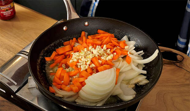 2. Морковь нарезать соломкой или натереть на крупной терке. Лук нарезать полукольцами, чеснок – мелко порубить или раздавить. На отдельной сковороде разогреть немного масла и обжарить морковь с луком до мягкости и лёгкой золотистости. Добавить чеснок и жарить еще 1–2 минуты, пока не появится аромат.