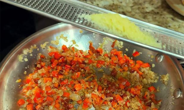 Поставьте сухую сковороду на огонь и слегка прогрейте семена зиры, кориандра и душистый перец, пока не почувствуете яркий аромат, затем измельчите их в ступке или кофемолке. Влейте на сковороду оливковое масло и обжарьте мелко нарезанный лук в течение пяти минут до появления приятной сладости. Добавьте к луку нарезанный кубиками болгарский перец и продолжайте готовить на небольшом огне до мягкости овощей.
