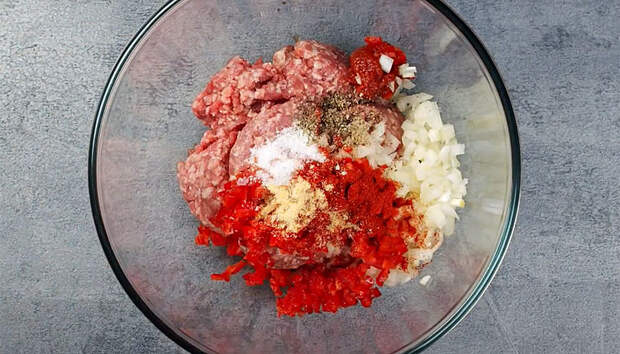 Лук и сладкий перец нарезать мелким кубиком. В глубокой миске смешать фарш, лук, перец, томатную пасту и специи.