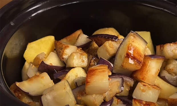 Нарежьте мясо средними кусками, чтобы при тушении они не пересохли. Если мясо подмороженное, дайте ему немного оттаять — так его легче нарезать. Баклажаны очистите от хвостиков, порежьте произвольно — можно кубиками или брусочками — и переложите в глубокую миску. Щедро посолите и оставьте на 15–20 минут, чтобы ушла горечь и выделилась лишняя жидкость. Пока баклажаны отстаиваются, займитесь картофелем. Молодые клубни разрежьте пополам или на четыре части.