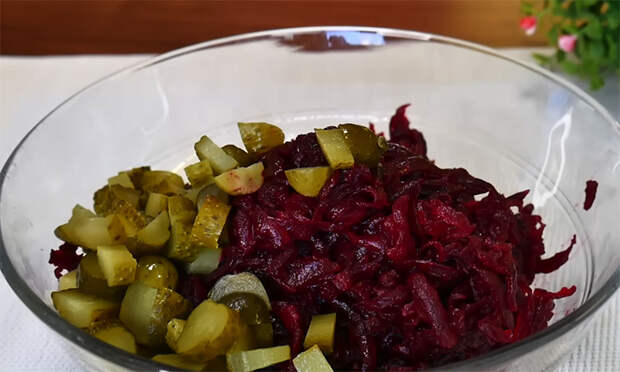 Свеклу промойте, отварите или запеките до мягкости, остудите и натрите на средней терке, после чего переложите массу в глубокую миску. Огурцы мелко нарежьте и добавьте к свекле, стараясь сохранять одинаковый размер кусочков, чтобы салат имел ровную текстуру. Яйца очистите, измельчите ножом и внесите в общую смесь.