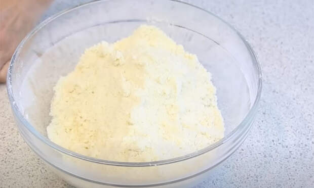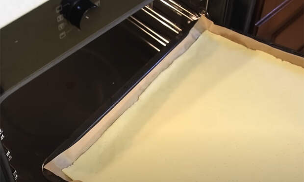 Начните с теста для нижнего коржа. Просейте муку, соедините её с солью и сахаром, добавьте нарезанное кубиками холодное масло или маргарин и быстро перетрите в крошку. Смешайте её с разрыхлителем, затем влейте смесь яйца и сметаны. Замесите тесто до мягкой консистенции, долго месить не нужно. Уберите его в холодильник на 20–30 минут.