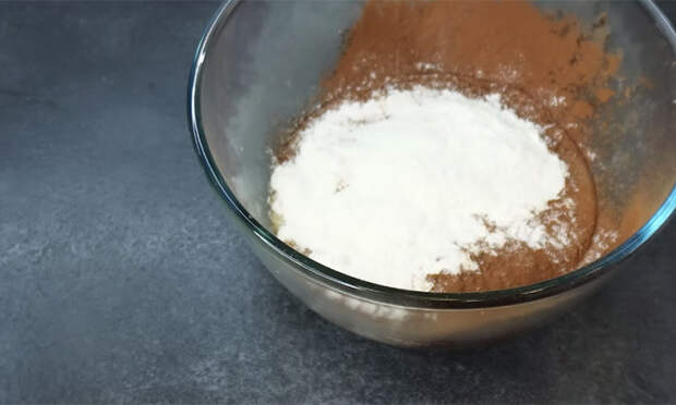 Обязательно просейте через сито какао-порошок, добавьте муку и разрыхлитель, а затем замесите гладкое шоколадное тесто без комочков. Подготовьте форму для СВЧ диаметром около 18 сантиметров, застелите ее дно пергаментом и перелейте в нее подготовленную смесь. Поставьте форму в микроволновку и выпекайте при мощности 800 Вт ровно 5 минут.