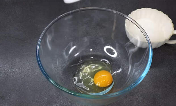 Разбейте в миску яйцо, всыпьте сахар и тщательно смешайте компоненты обычным венчиком. Влейте растительное масло и молоко, после чего снова хорошо перемешайте массу до однородного состояния.