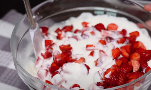 Промойте клубнику, удалите хвостики и нарежьте кусочками среднего размера. Если ягоды мелкие, оставьте их целыми. Переложите в миску творог, молоко, сахар и ванильный сахар. Измельчите блендером до полной однородности. Если блендера нет, протрите творог через сито и тщательно перемешайте с остальными ингредиентами. Соедините желатин с водой, оставьте до набухания.