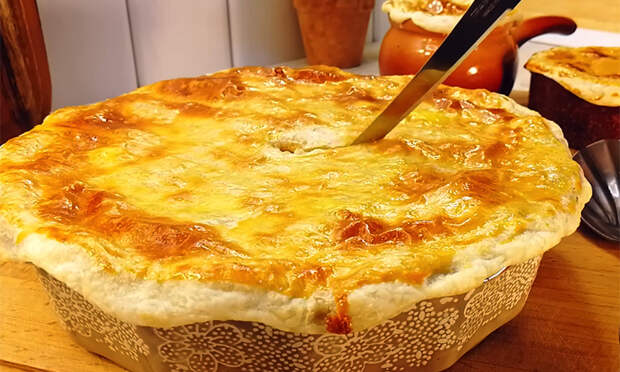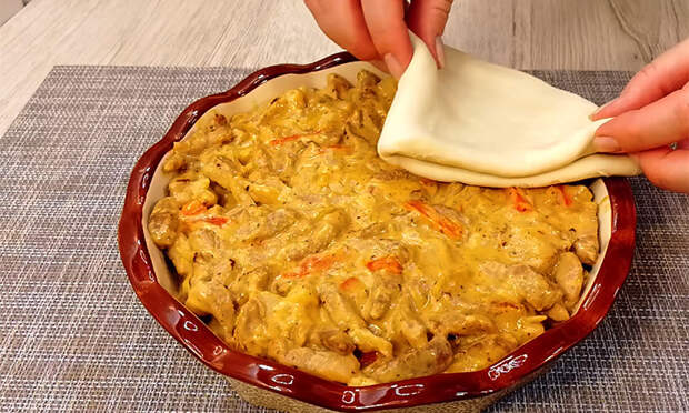 Сверху блюдо получается с хрустящим слоеным тестом, а внутри — нежнейшая, тающая во рту свинина в сметанно-горчичном соусе.