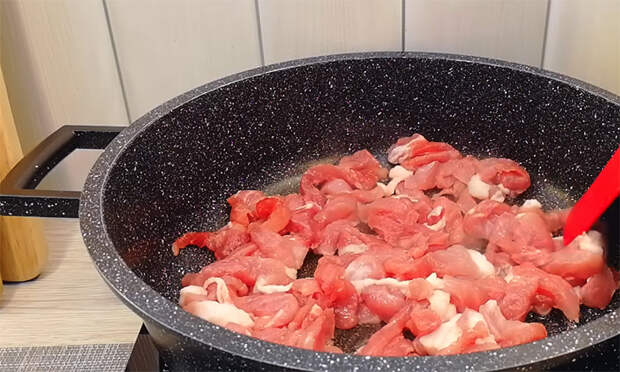 Окорок следует нарезать сначала тонкими пластинами, а затем тонкими небольшими брусочками. Хорошенько разогрейте большую сковороду, налейте растительное масло и отправьте обжариваться свинину, обжаривайте его в несколько заходов, выкладывая кусочки фактически в один слой, чтобы оно запечаталось и осталось сочным, а не варилось в собственном соку. Пока мясо обжаривается, подготовьте овощи: одну большую или две средних луковицы нарежьте произвольно, а также нарежьте один большой сладкий перец, который не обязателен, но сделает блюдо вкуснее.