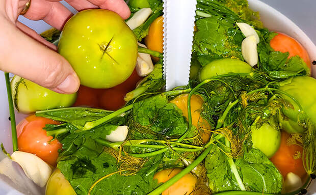 л. для рассола + 2 ч. л. в начинку Вода — 1 лПриготовление: Нарежьте зеленые помидоры крупными дольками, залейте литром воды, в которой растворите три ложки соли, и оставьте их просолиться около часа. Измельчите в блендере чеснок, острый и сладкий перец, часть петрушки, доведите смесь до состояния густой пасты.