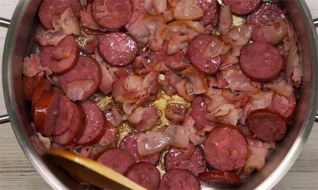 Подготовьте все ингредиенты заранее, нарезав репчатый лук мелкими кубиками, а морковь тонкими полукольцами для правильной текстуры зажарки. Свежую капусту и очищенный картофель измельчите небольшими аккуратными кубиками, колбасу нарежьте круглыми ломтиками, а бекон разделите на небольшие кусочки. Разогрейте кастрюлю с толстым дном на слабом огне, выложите в нее бекон и обжаривайте его в течение трех минут, чтобы вытопился жир.