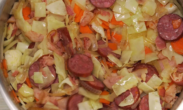 Отправьте в кастрюлю нарезанную колбасу и продолжайте готовить мясные продукты вместе еще три минуты, усиливая аромат копченостей. Всыпьте к мясу подготовленные лук и морковь, пассеруите смесь четыре минуты на слабом огне, периодически помешивая лопаткой, чтобы овощи стали мягкими и пропитались ароматами. Добавьте в кастрюлю кубики свежей капусты и обжаривайте все вместе еще три минуты, позволяя овощу слегка осесть.