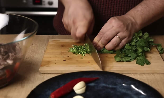 Старайтесь не делать слишком крупные куски, чтобы мясо гармонично распределялось по салату и каждый кусочек был пропитан заправкой. Подготовьте сладкий перец. Вымойте красные болгарские перцы, обсушите, разрежьте пополам, удалите сердцевину и семена. Нарежьте перцы тонкой соломкой, чтобы они давали салату хруст и цвет, но не перебивали остальные компоненты. Переложите нарезанный перец в большую салатную миску. Острый перец вымойте, при необходимости аккуратно разрежьте вдоль и удалите семена и перегородки, если не хотите слишком высокой остроты.