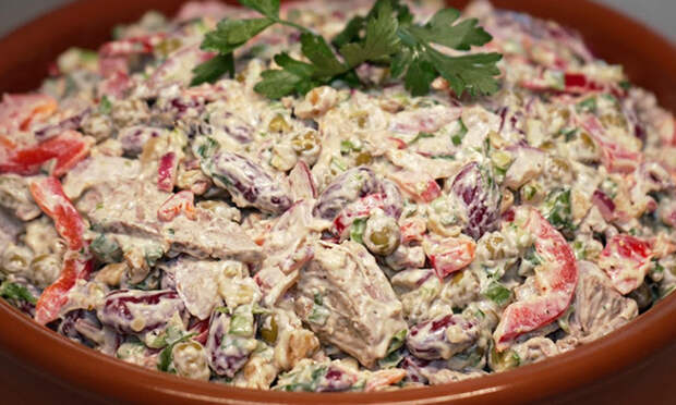 Приправьте молотым черным перцем, дополнительно соль не добавляйте до дегустации, так как в бульоне, фасоли и луке уже есть соль. Измельчите все до густой однородной массы удобным способом: в блендере, ступке или погружным блендером, постепенно регулируя густоту бульоном, чтобы получить консистенцию густого соуса, который можно равномерно распределить по салату. Теперь соберите салат. В большую миску выложите отваренную фасоль, нарезанную говядину, сладкий красный перец, острый перец, подготовленную зелень и отжатый маринованный лук. Добавьте нарезанные орехи, которые рубились ножом, они дадут нужную текстуру и ореховый хруст. Влейте ореховую заправку, перемешайте салат.
