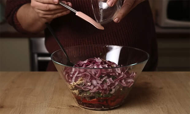 Сначала подготовьте лук, чтобы он успел промариноваться и отдать лишнюю горечь. Очистите красный лук, разрежьте его на четвертинки и нарежьте тонкими полосками или мелкими четвертькольцами, чтобы в салате лук равномерно распределился и не попадался крупными кусками. Переложите нарезанный лук в миску, добавьте сахар, соль и влейте сок лимона.