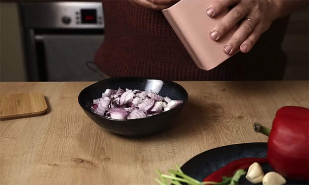 Тщательно перемешайте руками или ложкой, слегка пожмите лук, чтобы он пустил сок и напитался маринадом, затем оставьте при комнатной температуре, пока готовятся остальные продукты. Параллельно займитесь фасолью и мясом, если они не подготовлены заранее.