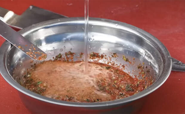 2. В отдельной миске смешайте: паприку, сушёный чеснок, мяту, орегано, чёрный перец и немного соли. Выжмите сок из четверти лимона и добавьте к специям. Влейте 150 мл газированной минеральной воды. Перемешайте. Оставьте на 5–10 минут, чтобы специи слегка «раскрылись» и напитали воду.