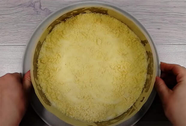 6. Выложите дно и бортики формы (разъёмной или обычной) пищевой плёнкой — так будет проще достать торт. Выложите первый слой песочной крошки (примерно 1/4 от всего объёма) и аккуратно разровняйте.